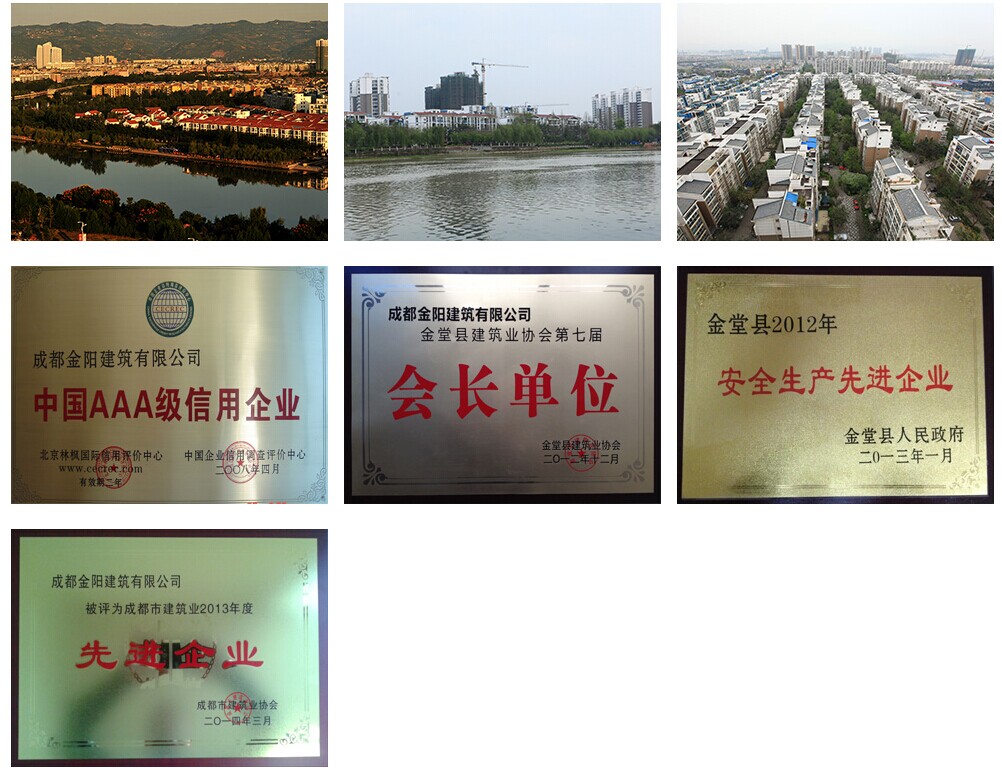成都金阳建筑有限公司组建于1986年,是房屋建筑工程施工总承包二级、市政公用工程施工总承包三级、钢结构工程专业承包二级、装饰装修工程专业承包三级、土石方工程专业承包三级资质企业,名列四川省建筑企业100强之一。公司自成立20多年来,先后承建了30米跨度100吨级行车车间和库房,中外合资三星级宾馆、商业大楼、医院门诊大楼、教学楼、公路、铁路、桥梁和住宅楼等工程,公司还承建了土地整理、安置房建设、道路和桥涵等多个政府投资项目。累计施工面积逾1500万㎡,工程合格率100%,优良率达40%以上,具有较高的社会声誉。1996年6月,组织了包括项目经理、管理团队、翻译在内的700余名建筑施工队伍远赴科威特承接修建228项目和三座清真寺工程项目及配套设施,受到了科威特国家住房局的肯定和赞许,成为金堂县第一个在国际上承接项目的公司,同时受到中川国际公司的表扬。公司承建的大型生态水景社区—金阳美丽水景城项目一期“金阳水景”、二期“金阳丽景”已经全面完交付业主使用,三期“金阳美景”正在分批施工中,一、二、三批次房源约15万㎡已交付使用,四批次正在施工中。